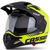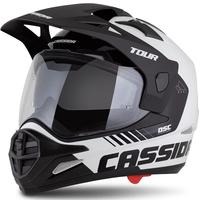 Cassida Tour 2.0 Dual -moottoripyöräkypärässä on polykarbonaattikuori, se on valmis kommunikaattorikuulokkeiden asentamiseen ja mahdollistaa MX-lasihihnan kiinnittämisen kypärän takaosaan.